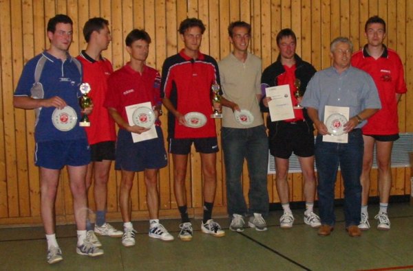 1913- also vor genau 90 Jahren - wurde der Sportverein Donaustauf gegründet. Dies war Anlaß genug, um quer durch alle Abteilungen Turniere und andere Feierlichkeiten zu veranstalten. Auch die Tischtennisabteilung lud deshalb zu einem sportlichen Wettstreit mit insgesamt sechs Mannschaften ein. Neben Mannschaften aus Bach, Sarching, Tegernheim und Neuhaus, die aus der nördlichen Oberpfalz anreisten, spielten auch zwei Mannschaften aus Donaustauf um die Plazierungen. Gespielt wurde mit Mannschaften zu je vier Spielern in zwei Gruppen: Gruppe A bestand aus dem VfB Bach, dem SV Sarching und dem SV Donaustauf I. Gruppe B setzte sich wie folgt zusammen: FC Tegernheim, SV Donaustauf II und DJK Neuhaus, mit denen uns eine jahrelange sportliche Freundschaft verbindet.Innerhalb einer Gruppe spielte jede Mannschaft gegen die jeweils anderen zwei und ein Match bestand wiederum aus den Paarungen erster der Rangliste der Mannschaft x gegen den ersten der Mannschaft y, zweiter der Mannschaft x gegen den zweiten der Mannschaft y, usw. Maximal also vier einzelne Spiele, so dass das Endergebnis entweder 4:0, 3:1 oder 2:2 (in der Vorrunde kein Entscheidungsdoppel) lauten konnte. Wurden alle Spiele ausgeführt, so gab es eine Plazierung innerhalb der Gruppen. Danach kämpften die jeweils Gleichplazierten einer Gruppe um die Plätze eins, drei oder fünf. Hier das Endergebnis: 1. FC Tegernheim ..., mit einem Herzschlagfinale das letzlich nach 2:2 Spielen mit dem Schlußdoppel entschieden werden mußte. 2. SV Sarching ..., der gewiß in der nächsten Saison eine gute Figur in der 1. Kreisliga abgeben wird. 3. SV Donaustauf I ..., mit leichten Formschwächen und gewiß nicht dem letzten Willen, die Spiele gewinnen zu wollen (man ist ja schließlich Gastgeber - und sollte sich auch aus diesem Grund wohl zurückhalten, da schon 1998 beim 10-jährigen Jubiläum der Donaustaufer TT-Abteilung ein erster Platz abgeräumt wurde). 4. DJK Neuhaus ..., die sich wacker geschlagen haben und wirklich gern gesehene Gäste waren 5. VfB Bach ..., die sich nach anfänglichen Schwierigkeiten (und wohl etwas Trainingsrückstand) gut in das Turnier gespielt hatten. 6. SV Donaustauf II ..., die einfach mit dabei waren.